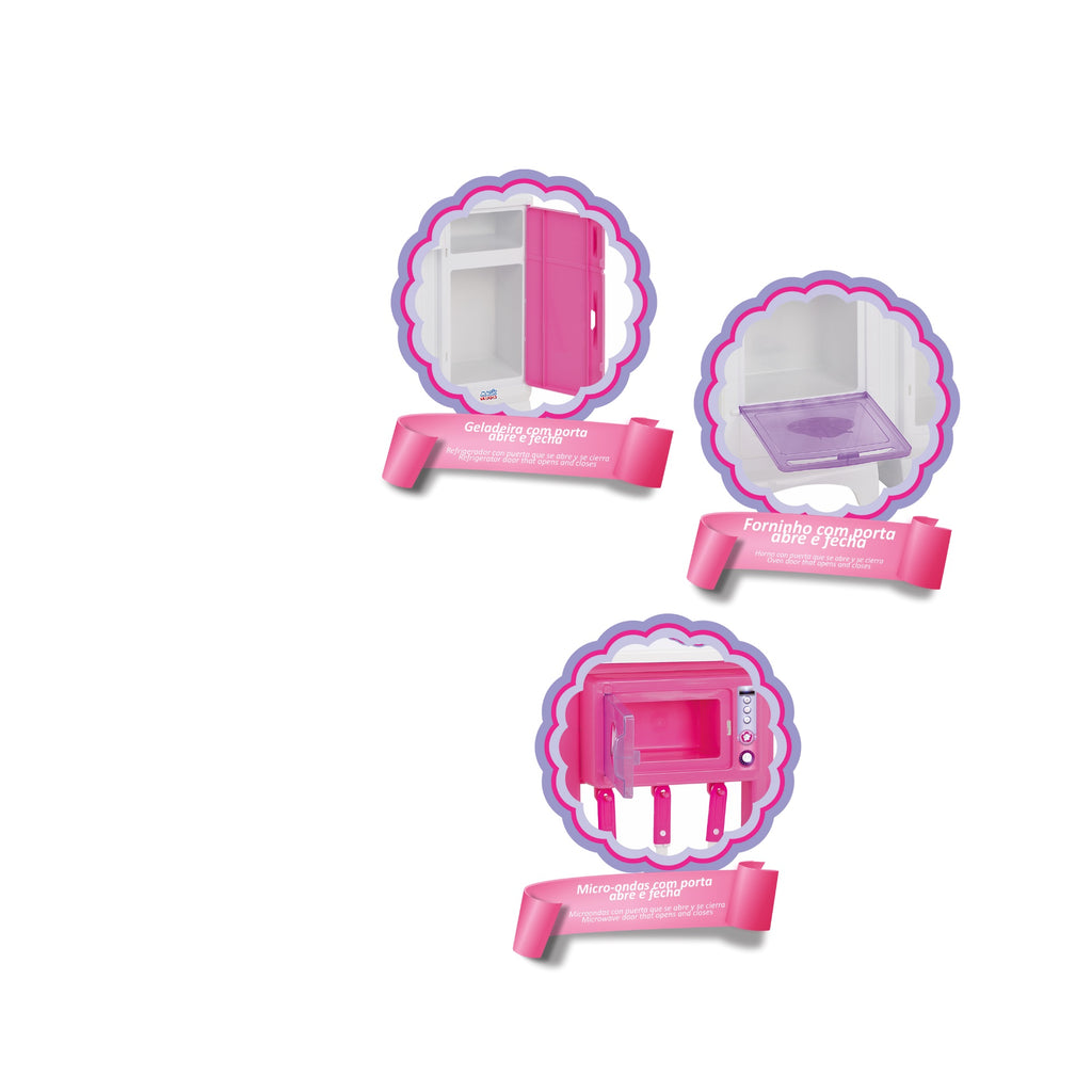 Ela vem com microondas, forninho e geladeira com portas que abrem e fecham, além de muitos acessórios como pratinhos, copinhos e talheres.