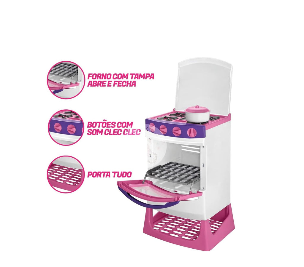 Os botões giram e fazem barulhinho de "crec-crec", a tampa do fogão e do forno abre e fecha e inclui uma grelha conjugada.
