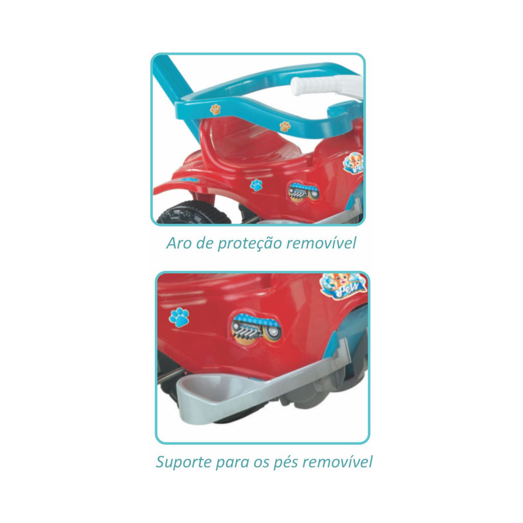 O Tico Tico Pets possui design muito bonito, apresenta um guidão com a estampa de um cachorrinho proporcionando mais alegria para a criança,  ideal para tornar os passeios com as crianças mais legais.  Além de ser uma atividade divertida, andar de velotrol oferece diversos benefícios para a qualidade de vida dos pequenos: estimula o exercício físico, fortalece as perninhas e desenvolve da coordenação motora. Ele tem assento anatômico que oferece mais conforto para a criança durante o trajeto. Conta com suporte para os pés e aro de proteção que pode ser removido, oferecendo total segurança em qualquer passeio.